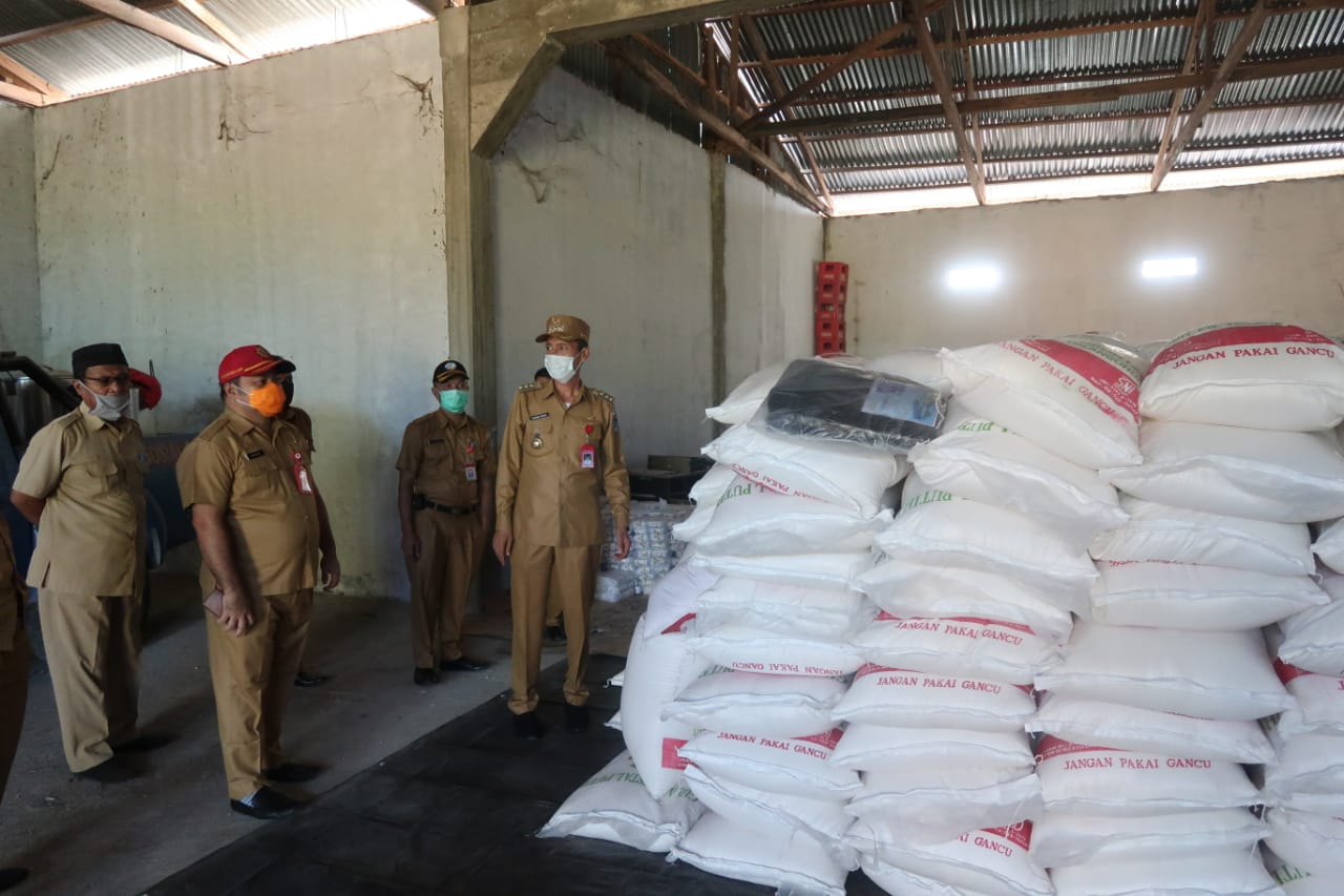 BUPATI Bolaang Mongondow Selatan (Bolsel), Hi Iskandar Kamaru S Pt, didampingi Sekretaris Daerah (Sekda) Marzanzius Arvan Ohy S STP, meninjau kesiapan logistik yakni sembako yang akan disalurkan ke masyarakat, yang terdampak ekonomi akibat pandemi Covid-19 (Corona Virus Desease 2019), Senin (13/04/2020).