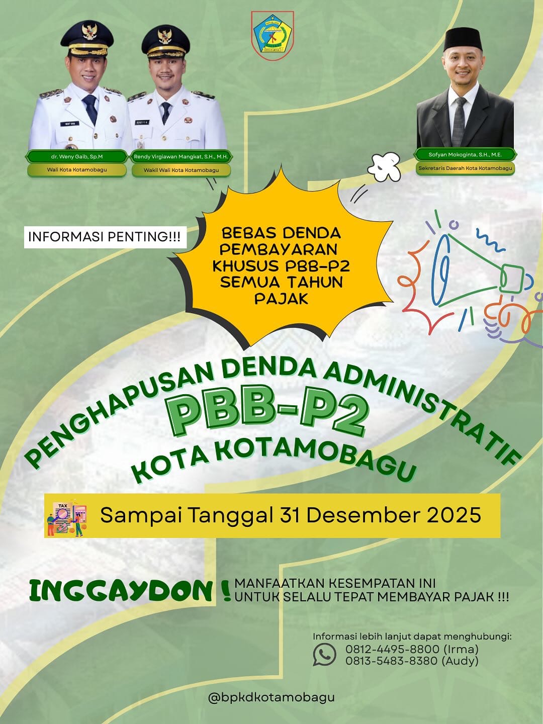 “Pemerintah Daerah Kota Kotamobagu memberikan kesempatan kepada seluruh wajib pajak untuk melakukan pembayaran PBB tanpa dikenakan denda administrasi. Penghapusan ini diharapkan dapat meningkatkan kesadaran masyarakat dalam melunasi kewajiban pajak,” ujarnya.